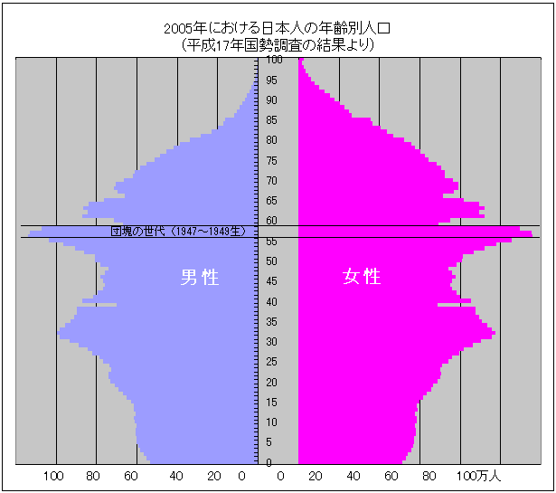 人口の多い世代は、死亡率が低くとも死亡者数は前後の世代よりも多くなりますから、この方法では、団塊の世代が平均寿命を左右してしまいます。ちなみに、終戦前後(1945-1946年生まれ)の世代の年齢あたりの人口は平均140万人ですが、団塊の世代(1947-1949年生まれ)になると220万人を超えます。